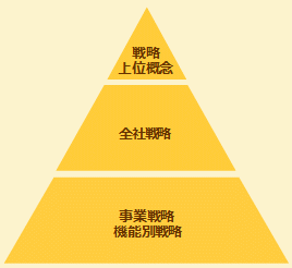 中期経営計画は前述の“戦略上位概念”を含む「全社戦略」、各事業の個別戦略である「事業戦略」およびR&D、マーケティング、人事・組織、財務など各機能の戦略となる「機能別戦略」で構成されます。