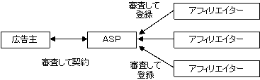 1) 広告主はASPと契約をし、アフィリエイターはASPに登録します。ASPは広告主、アフィリエイターの双方を審査しパスした場合のみ契約、登録を行います。