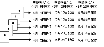 ステップメールとは、あらかじめ用意した連続性のある複数のEメールを設定された間隔で、順番に購読者に配信するシステムのことです。メールマガジンは購読者全員が同じ日に同じメールを受け取りますが、ステップメールは以下のように申し込日にかかわらず、購読者は必ず第1回目のメールから受け取ることができます。